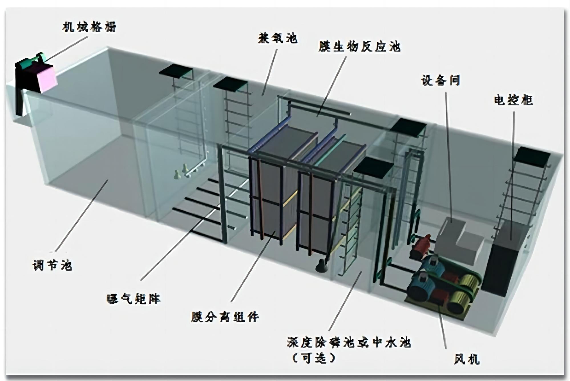 工藝原理:膜生物反應(yīng)器(MBR)工藝主要由兼氧池、MBR膜生物反應(yīng)池、深度除磷池等部分組成。通過好氧、厭氧菌的分解作用、中空纖維膜的截留作用、強化除磷填料的吸附作用等實現(xiàn)中水回用或達標排放。